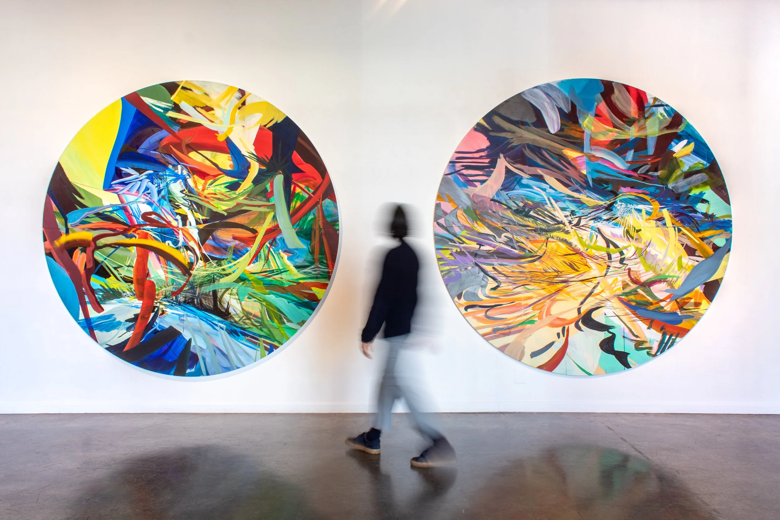 Acrylic gouache, fluid acrylic, acrylic spray paint, acrylic mediums, mural cloth and yupo collage on shaped wood panel