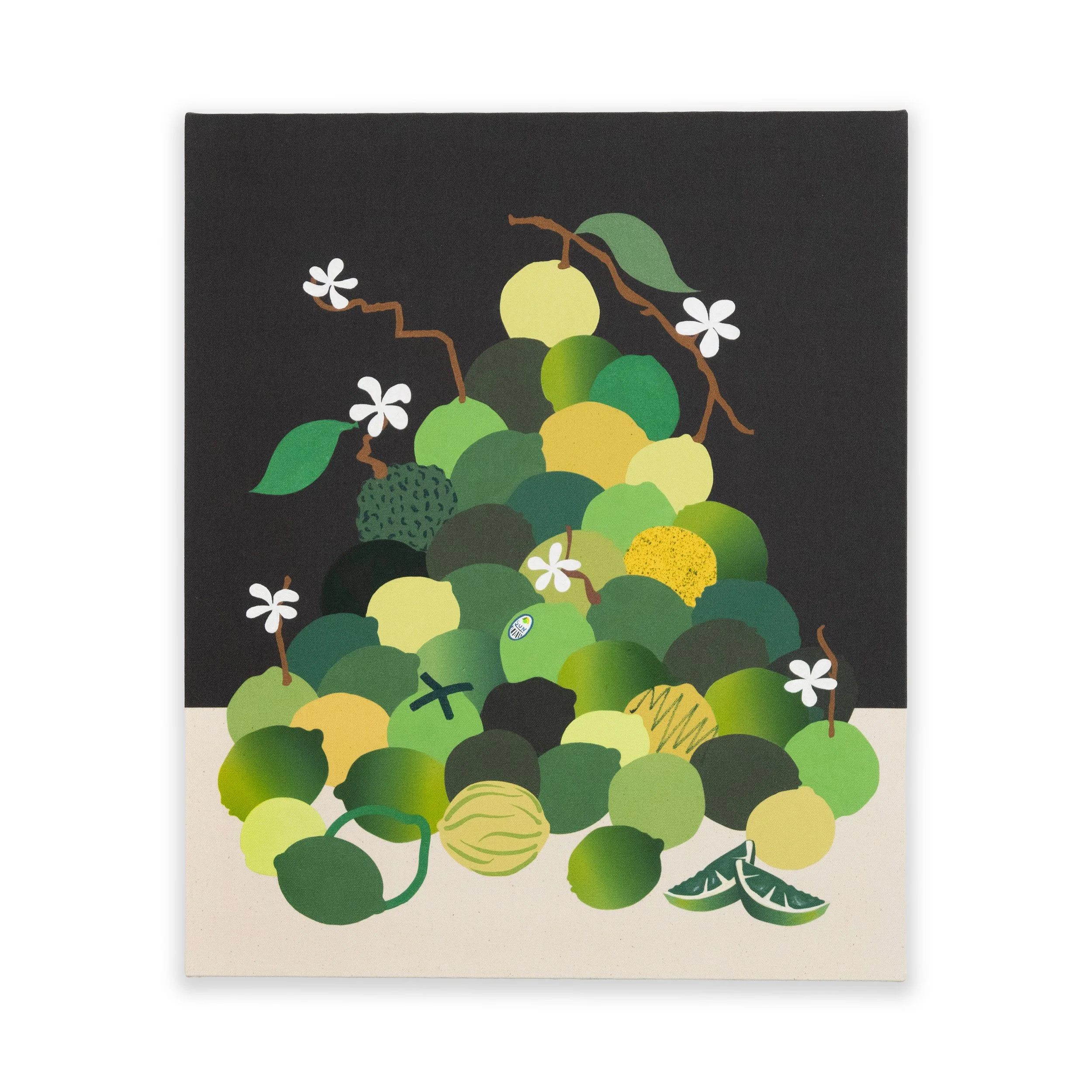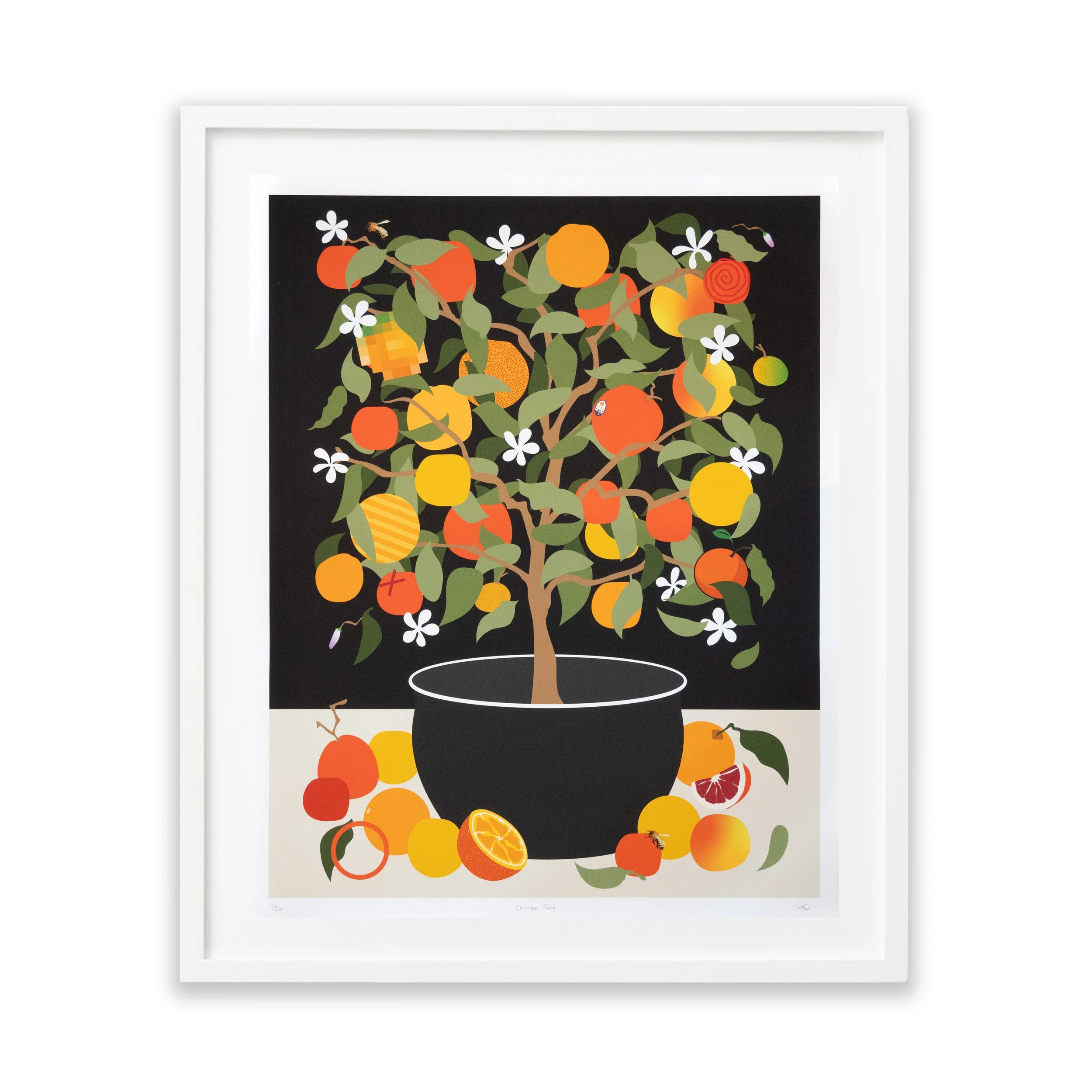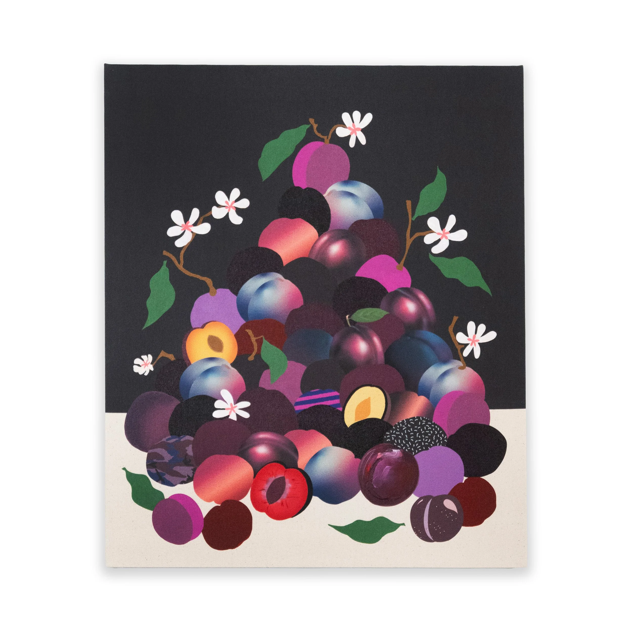 Building on the style of his past work, the prints feature fruit piles, bowls of fruit, Arborist motifs, and botanical forms rendered in pigmented ink on paper or printed canvas editions, with hand-painted details that balance the artist’s hand with mass production.