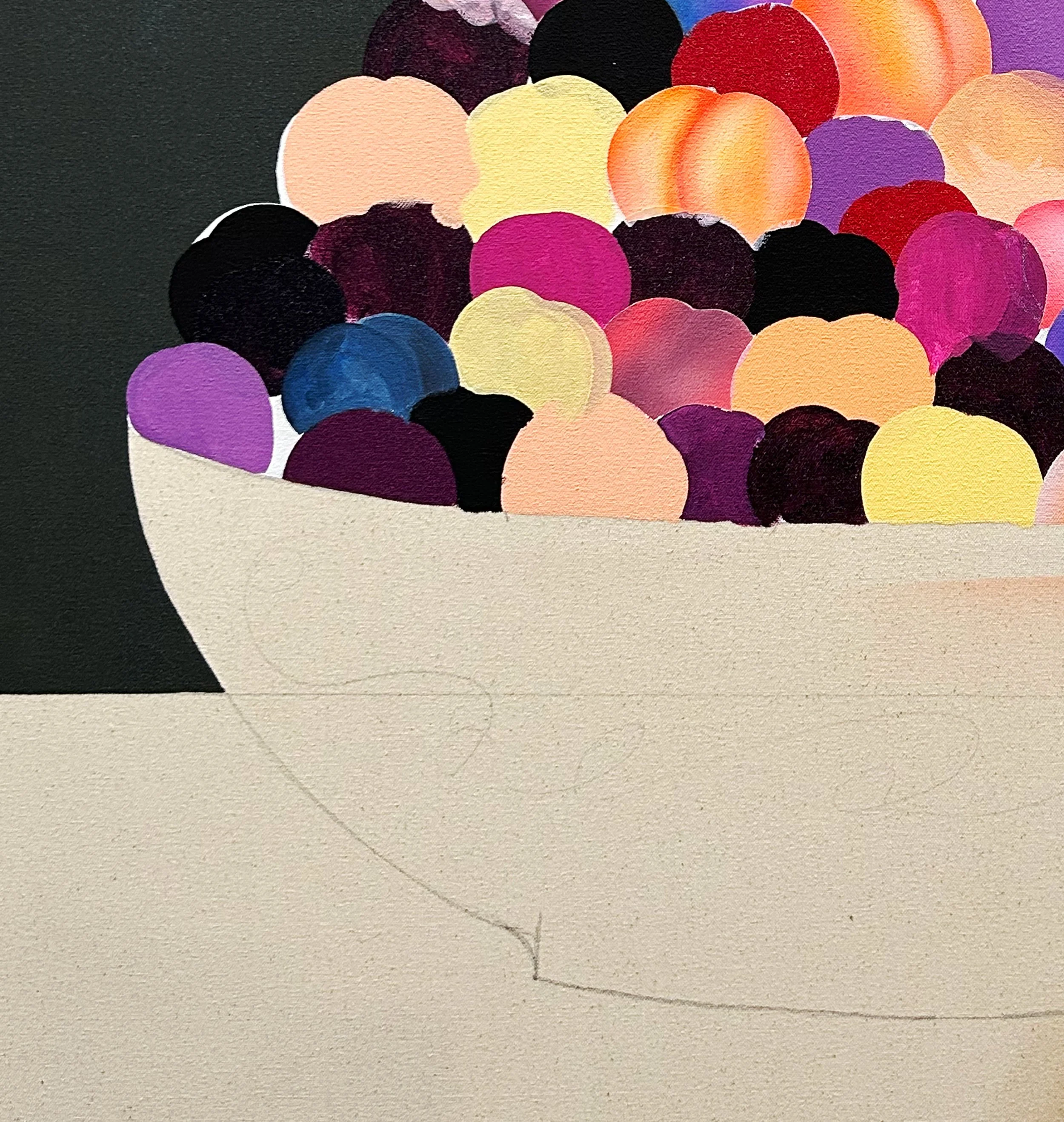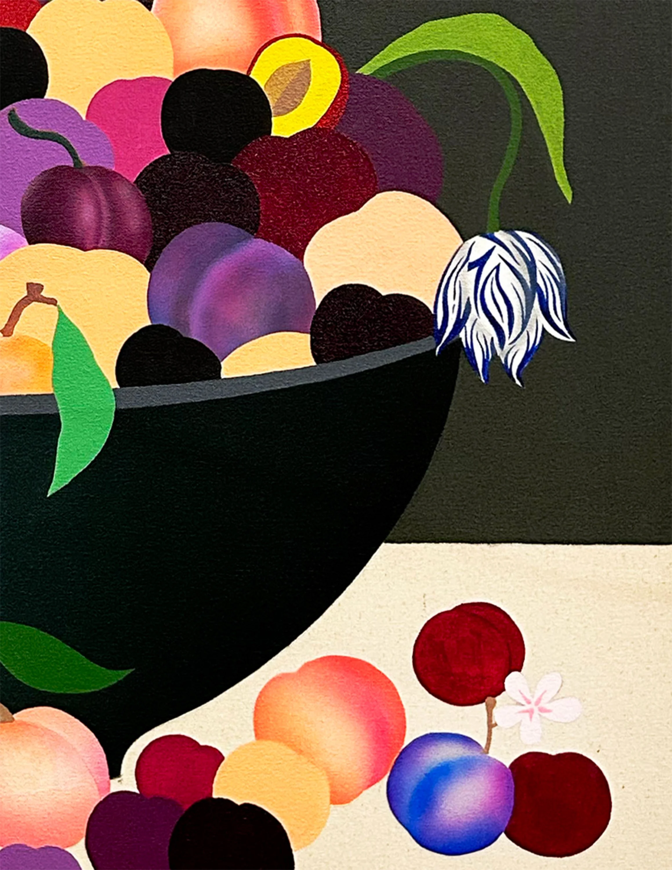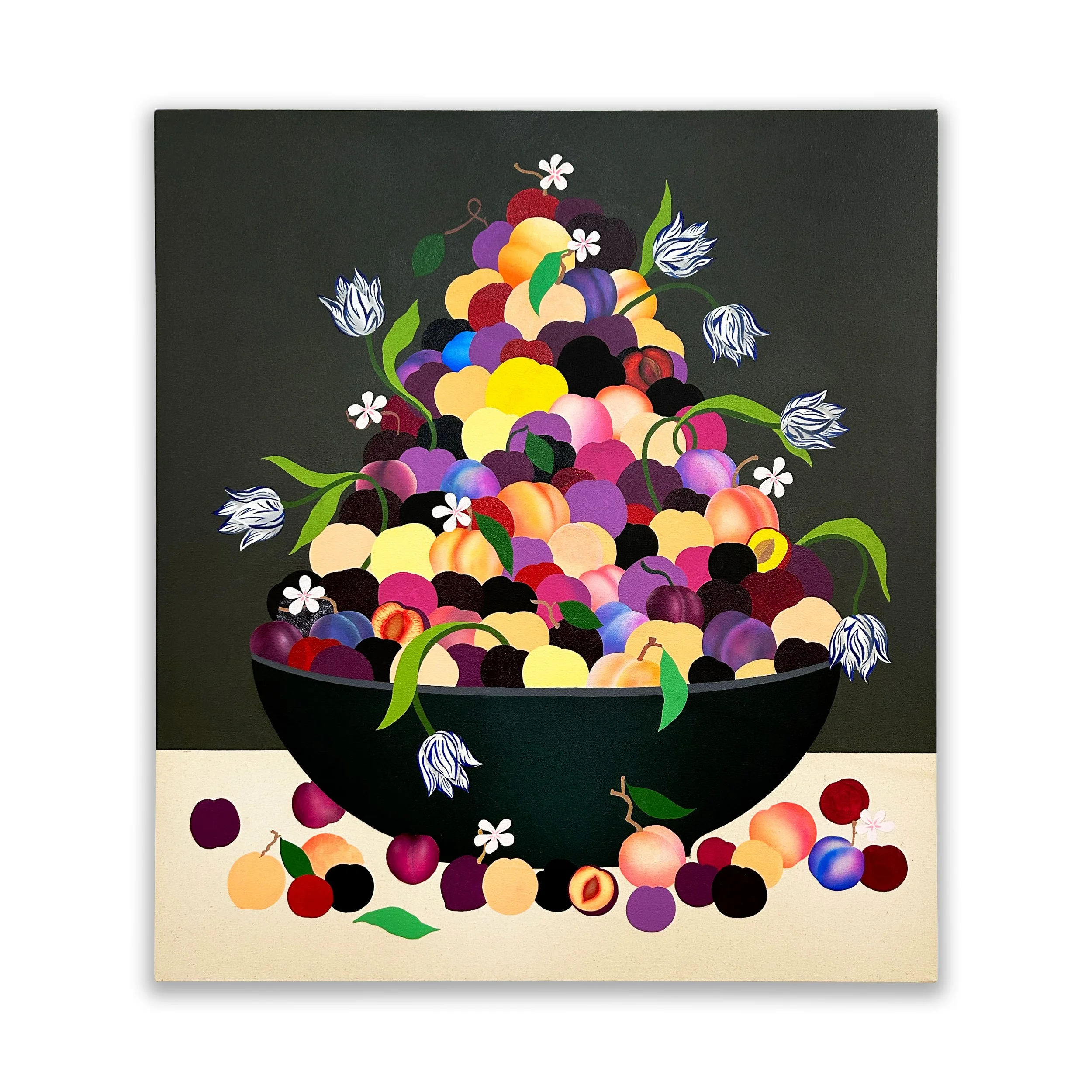 “Green Thumb, a visual exploration where the boundaries between nature, art, and everyday design blur into a vibrant tapestry of color and form. This new body of work delves into the world of flowering vines and fruit bowls adorned with blooms, drawing inspiration from the rich tradition of European still life masters and the precision of scientific illustration.