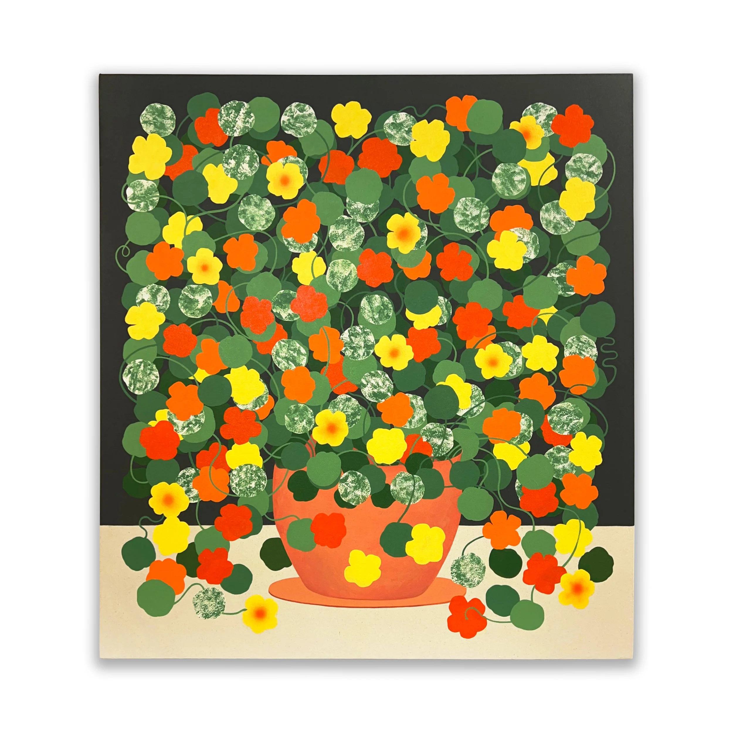 D’Onofrio’s technical aptitude—the slow layering and crisp edges—belies the critical message. Where does image-making end and pattern begin? Where does pattern end and kitsch begin? Where does idiosyncrasy end and genre begin? Where does genre end and commercialism begin? A cascading set of questions. Ultimately, Green Thumb is a comment on making, on consuming, on ornamenting—cheeky, wry, and tongue-in-cheek.