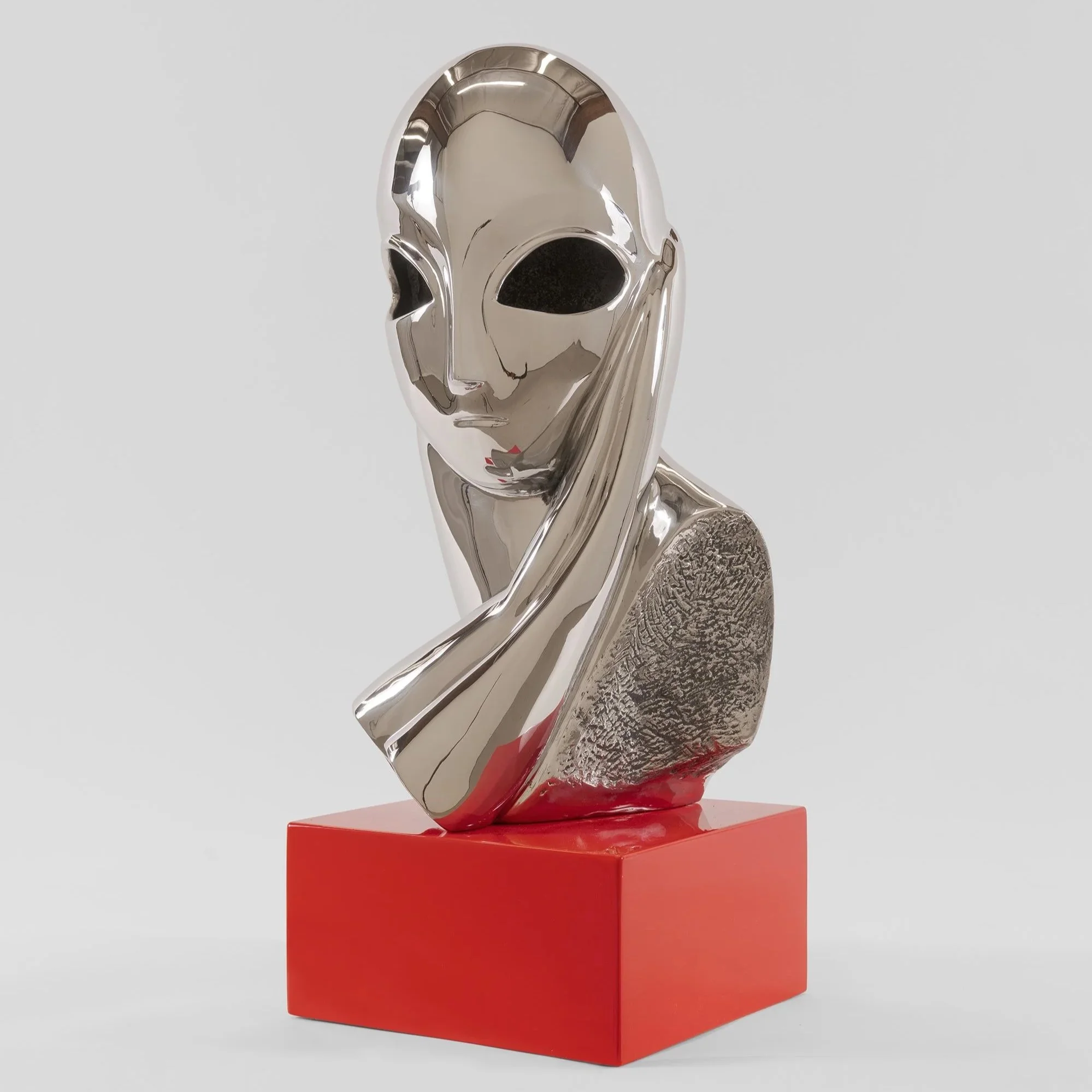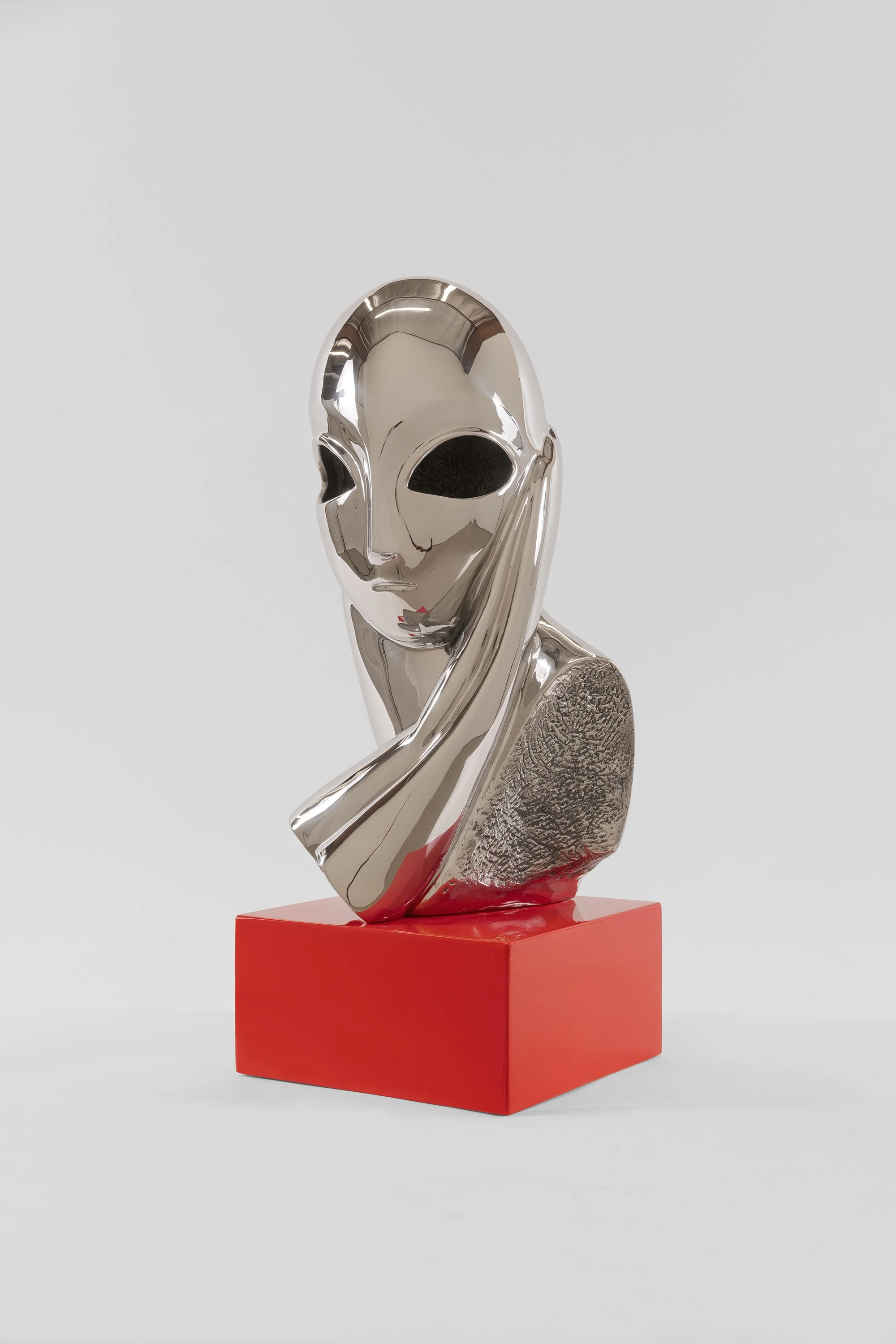 This work by Nathan Mabry references Constantin Brâncuși’s Portrait of Mademoiselle Pogany (1912), an iconic sculpture that departs significantly from conventional portraiture, but also invokes ethnographic inspiration. Mabry adopts the simplified form of this modernist icon and accentuates and removes features in order to make it resemble a mystical outer-space mask. The work also functions as an incense burner, releasing a custom scent from the eyes. Mabry’s work infuses a range of visual resources such as ancient artifacts, modernist sculpture, pop culture, and minimalism. Mabry samples and appropriates these elements in order to question the narratives of progress that frame the history of Western art, and to interrogate the values and meanings of his sources.