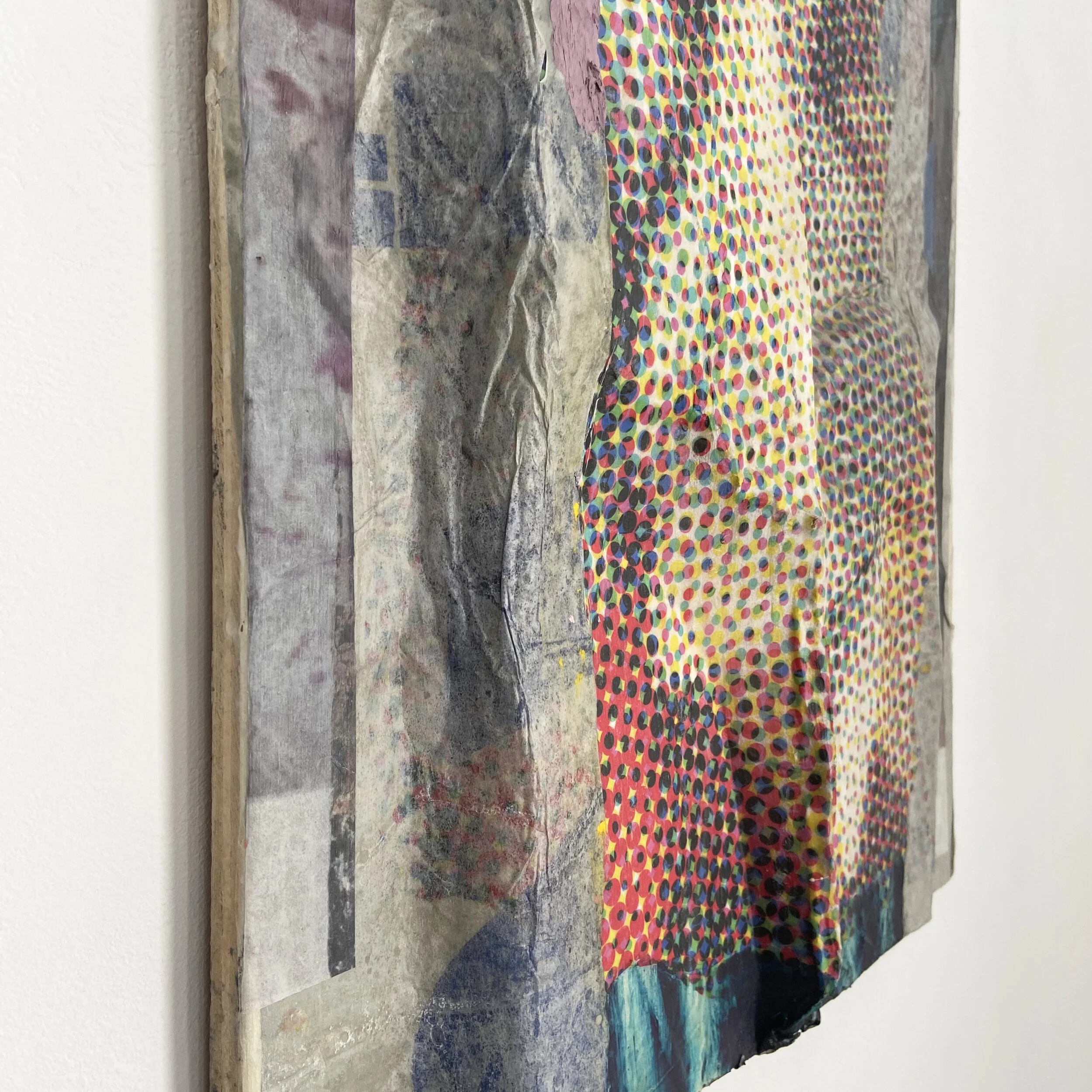 The monotypes exist most closely to what might traditionally be understood as a painting, given their relative two-dimensionality; however, the elements at play seek to muddy the origin of their making. Their surfaces, built up with thin films of color, raise questions about the artist’s process and the interdependency of multiple modes of mark-making. Montgomery’s shims utilize assembly, form and color to disrupt the singular experience of a painting as background and foreground colors interact and shift relative to a viewer’s position. In his complex collages, Montgomery makes use of a wide variety of materials that mimic painting, including paper, clay and fiberglass, to offer a different painting each time one changes their point of view.