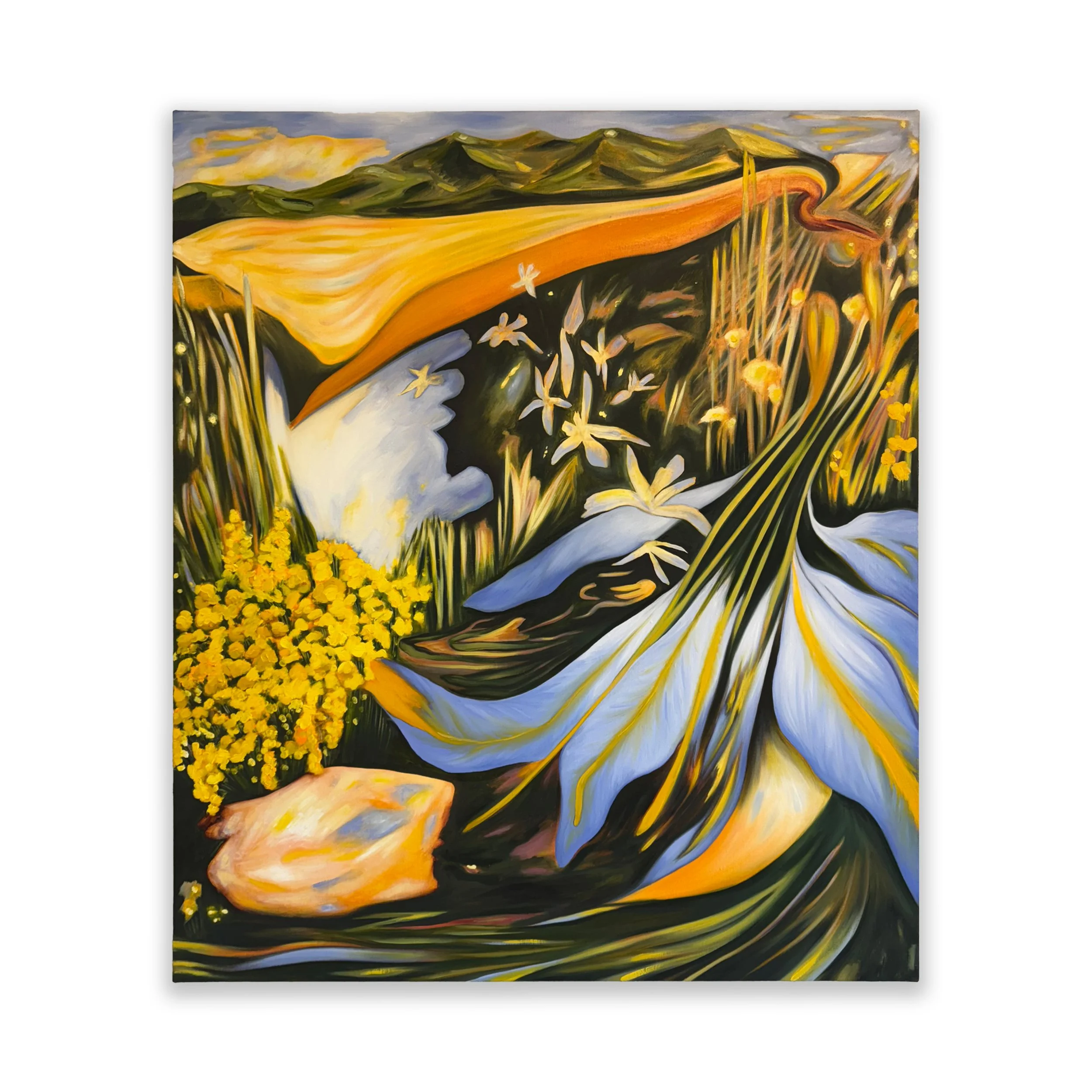 Sabrina Piersol (b. 1995, Greenwich, CT) is a Colorado- based painter exploring the intersection of abstraction and representation. Her work is deeply informed by early 20th- century American painting traditions, as well as the fragmented structure of the Classical Greek poetry of Sappho. Piersol balances abstract forms with explicit references to nature, maintaining accessibility while pushing the boundaries of perception. Her paintings explore themes of desire, temporality, fluidity, and speculative extrapolation. Each piece invites viewers to envision alternate pasts and possible futures, creating spaces for reflection and transformation.
