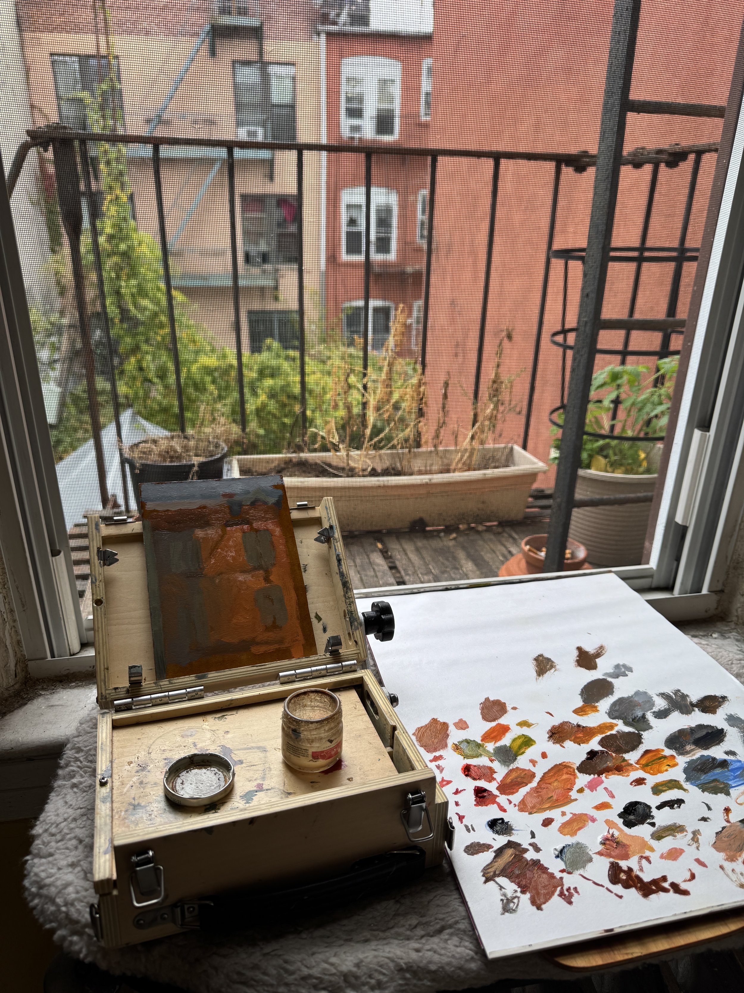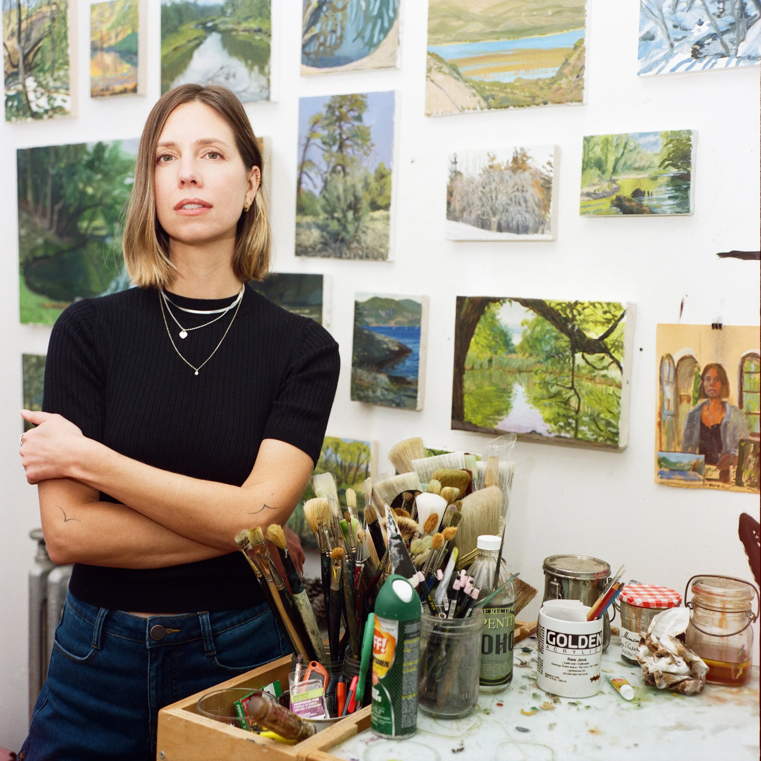 “In the landscapes, I work directly from the world, tracing color and light as they unfold over a few hours. They are records of what I perceive, but also containers for the sounds, temperature, feelings, and thoughts that accompany that seeing. In the selfies, others locate themselves through reflection, sending an image charged with self-awareness, vulnerability, and desire. Both subjects — and the way I paint them — mark thresholds between interior and exterior experience, between seeing and being seen.”